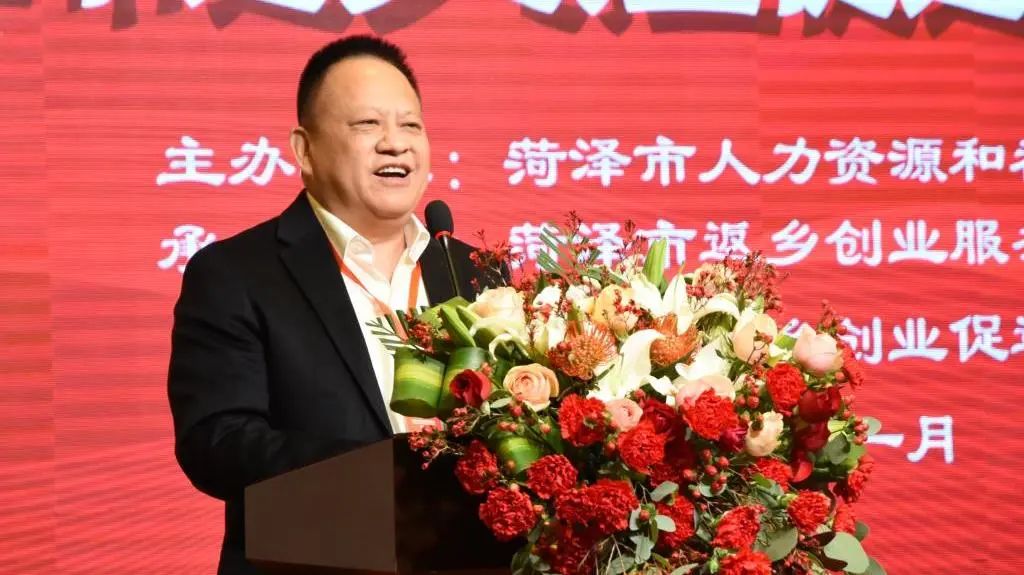 菏泽市返乡创业工作领导小组办公室主任、市人社局一级调研员王海林宣读王磊发来的贺词