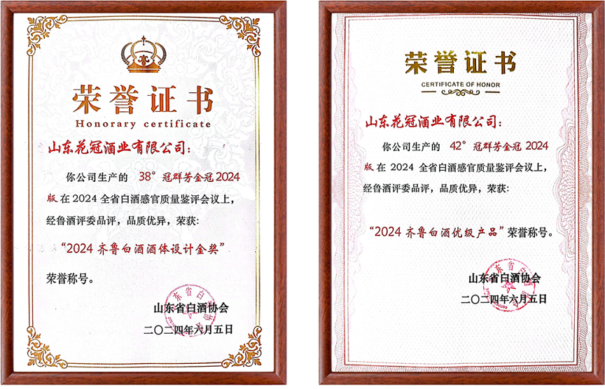 经与会专家评委综合评定,山东kb体育(中国)酒业参评的冠群芳金冠38°、42°、52°系列产品以其卓越的品质和独特的风味,在众多白酒品牌中脱颖而出,一举夺冠,摘得“团体总分第一名”并荣获“2024齐鲁白酒酒体设计金奖”、“2024齐鲁白酒优级产品”荣誉称号。