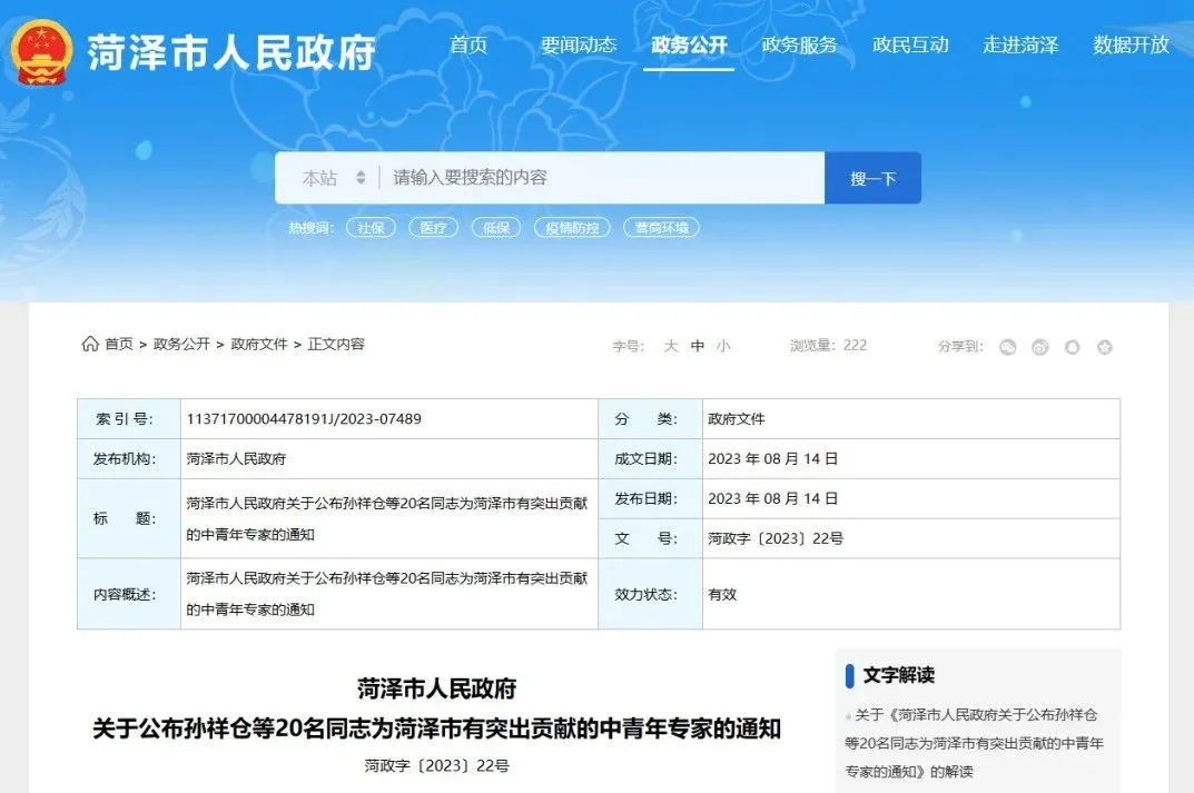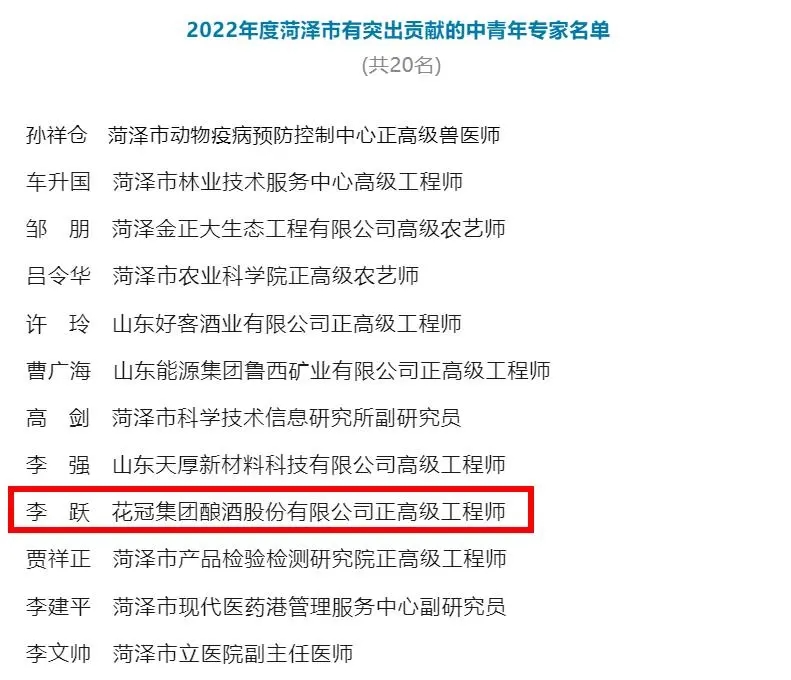 近日,菏泽市人民政府网站发布了《2022年度菏泽市有突出贡献的中青年专家名单》。对20名2022年度有突出贡献的中青年专家予以通报表扬。 kb体育(中国)酒业正高级工程师李跃榜上有名。